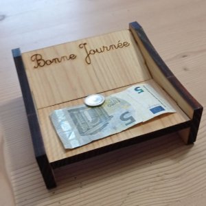Il s’agit d’un petit plateau que l’on pose sur le comptoir d’un commerçant. La partie intérieur est creusé, ce qui permet de facilement rendre la monnaie.