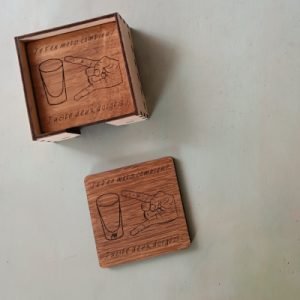 Ce lot de 4 sous-verres est rangé dans une belle boîte en bois. Vos invités apprécieront son dessin et son texte rigolo.