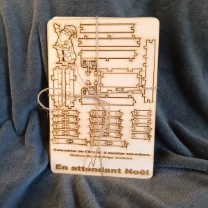 La plupart de nos décorations de Noël sont vendues sur planche à monter soi-même. Ainsi, vous aurez la satisfaction d’avoir fabriqué vous même ce joli calendrier de l’avant. Il existe des notices de montage pour tous les modèles : En Attendant Noël et aussi pour le panier à bûche.